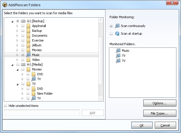 The Add/Rescan files to the Library dialog also allows you to monitor selected folders for any changes to Media Files so that the library is automatically updated. To do so select a folder in the left hand side and under and under Folder Monitoring you can: