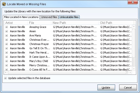 - The Files Located in New Locations tab shows all files that were moved and have been found in a new location by Locate Moved/Missing Files. Enable Update selected files in the database if you want to update the paths on selected files in the database with the new locations found.