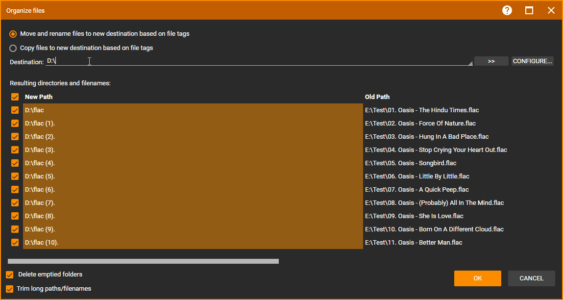 - Move the files (if you're organizing tracks on your hard drive). Enable Delete emptied folders if you wish the original folder(s) to be deleted after all files have been removed from it.