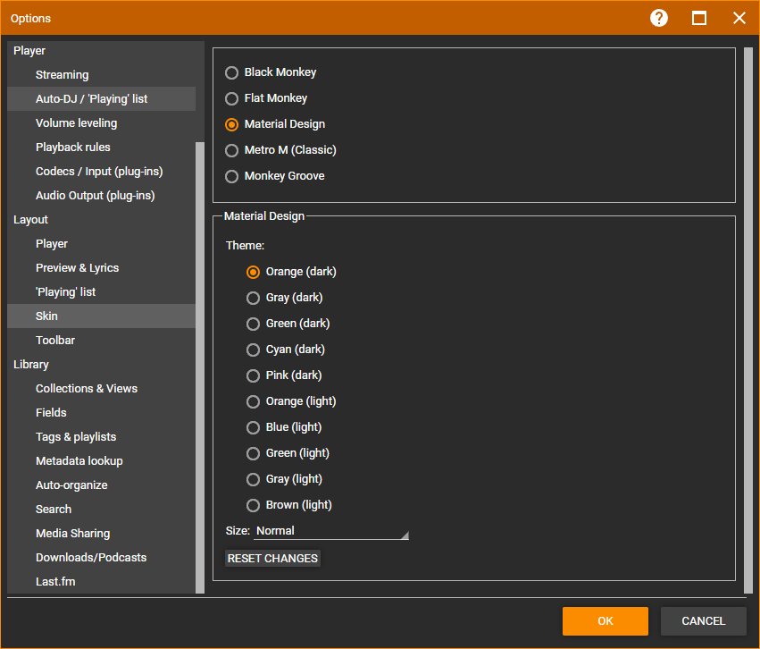 Skins can have additional options you can configure via Tools > Options > Skin from the Main Menu. Select the Skin and then change any settings available. This include the colors used (Monkey Groove) or the size of text (Material Design).