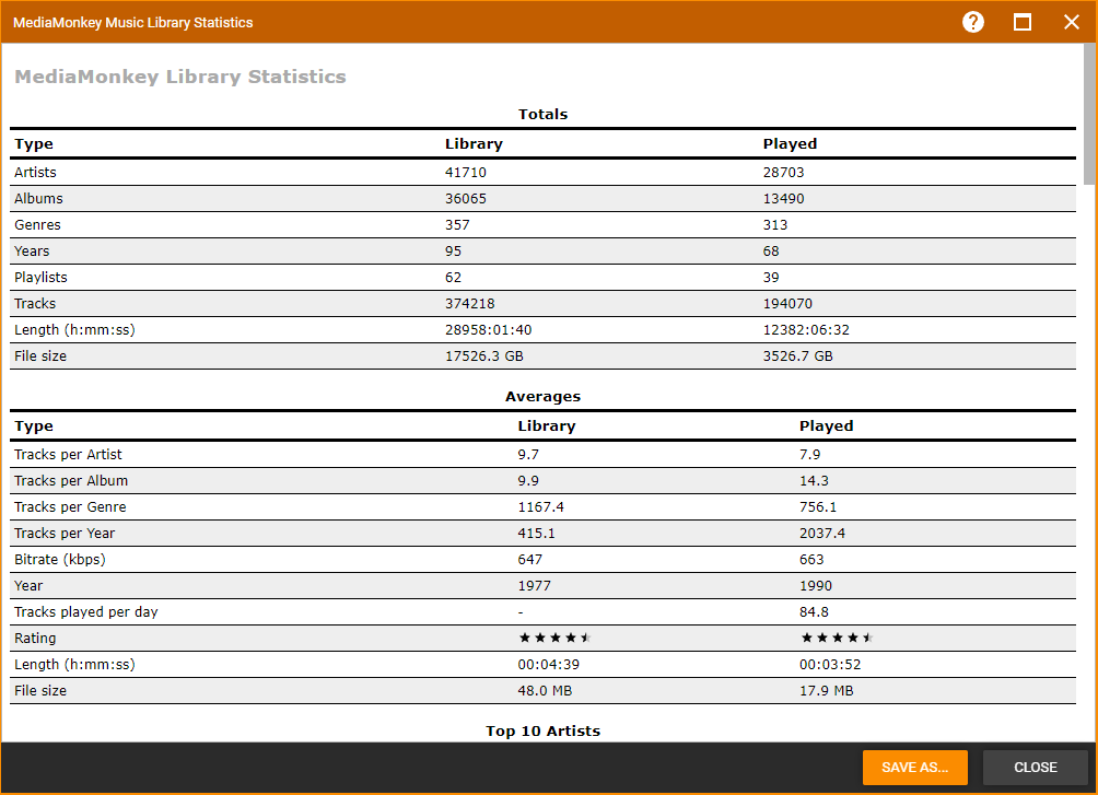 To generate a Statistics report use File > Reports > Statistics from the Main Menu. A new window will open with statistics of your MediaMonkey Library. You can use Save As if you want to save this report to your computer.